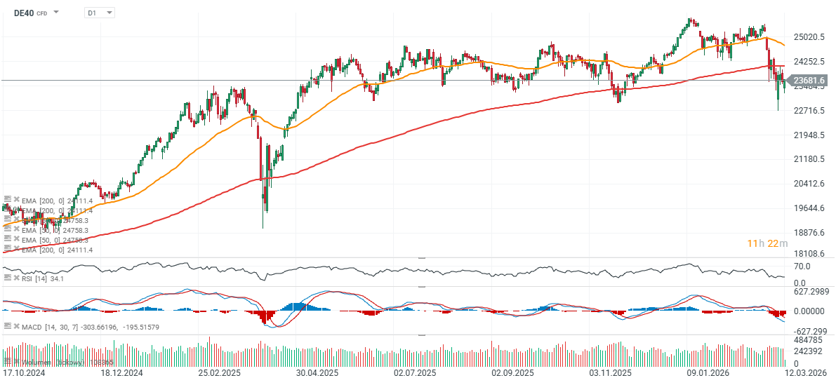 Evropa se po slabším otevření pokouší zotavit, přičemž německý DAX se nyní obchoduje blízko nuly. Investoři stále musí přeceňovat rostoucí geopolitické riziko, protože ropa Brent se postupně vrací směrem k 100 USD za barel. Nové zprávy o útocích na tankery, narušení provozu v přístavech a dalších vlnách dronových a raketových útoků na Blízkém východě dál doléhají na globální sentiment, zatímco dřívější uvolnění strategických rezerv ze strany IEA je vnímáno převážně jen jako krátkodobý polštář, nikoli jako trvalé řešení.