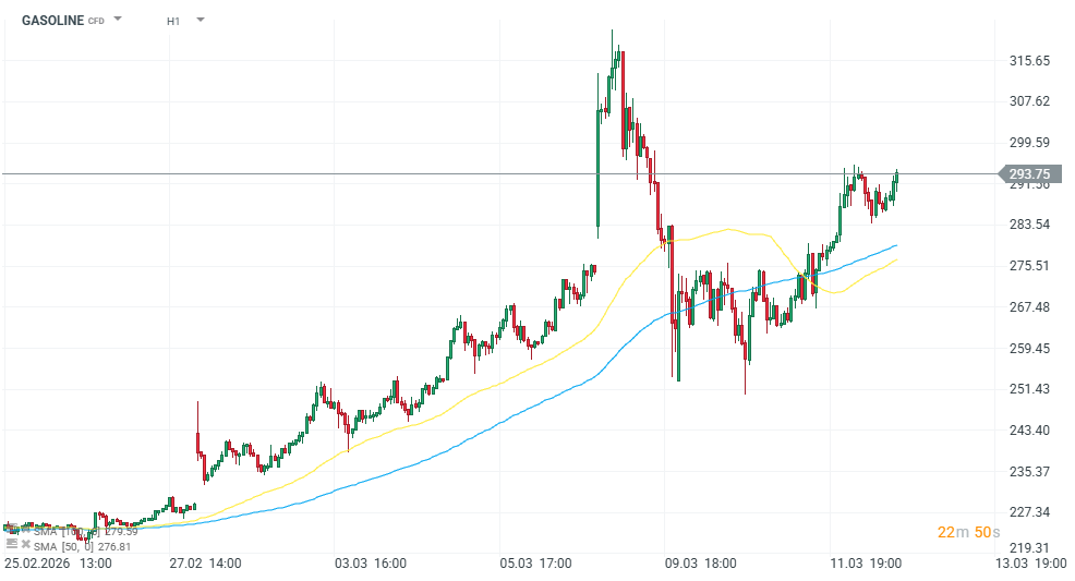 Futures kontrakty na benzín v USA dnes pokračují v růstu, přičemž ceny benzínu přidávají více než 5 % na zhruba 2,9 USD za galon (1 galon = 3,79 l). Cena benzínu do značné míry odráží růst cen ropy, která se dnes opět blíží hranici 100 USD za barel u ropy Brent a 95 USD u ropy WTI. Cena benzínu od začátku konfliktu narostla o více než 25 %. Nejvyšších hodnot dosáhla v pondělí 9. března, kdy se cena dostala přes 3 USD za galon. Historicky byly takto vysoké ceny benzínu naposledy v dubnu 2024. Od té doby se cena stabilně držela pod hranicí 2,5 USD za galon.