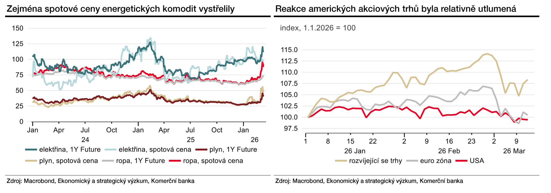 Vzdušné úroky na USA a Izraele na Irán a následná Iránská odpověď směrem ke svým sousedům s cílem (mimo jiné) ochromit energetickou infrastrukturu přinesl do cen ropy výraznou geopolitickou přirážku. Vyšší ceny zejména ropy a plynu energie zvedly na trzích nejistotu, a kromě energetických komodit významně ovlivnily akciové trhy po celém světě.