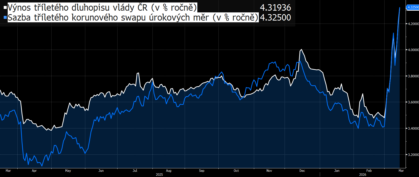 Borkovec krok banky vysvětluje prudkým růstem sazeb takzvaných úrokových swapů, jenž nastal v důsledku války v Íránu. Jak říká, tyto swapy „určují do velké míry cenu peněz pro banky a jejich úvěry“. Dává za příklad tříleté korunové swapy úrokových měr, které těsně před úderem na Írán vykazovaly sazbu 3,4 %, leč během jednoho týdne se podle něj dostaly na úroveň 4,14 %. Včera podle dat agentury Bloomberg uzavřely už dokonce na sazbě 4,22 %. A během dnešního obchodování už překračují úroveň 4,3 % (viz graf Bloombergu níže: modrá křivka).