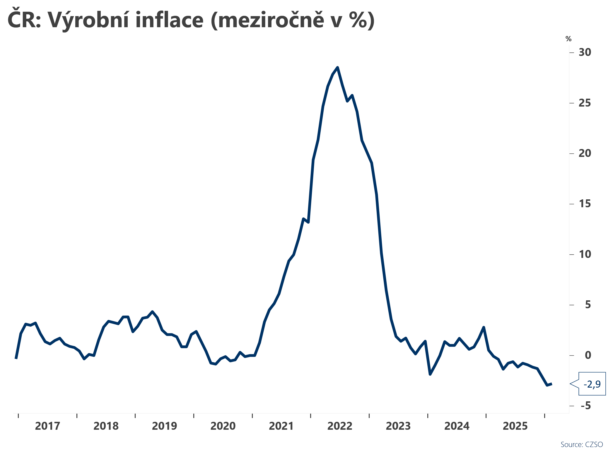 Výrobní ceny v červnu v Česku dále zvolnily. Meziroční dynamika cen průmyslových výrobců poklesla z 1,9 % na 1,4 %, což víceméně odpovídá poslední prognóze České národní banky. Zvonila i dynamika cen stavebních prací (na 4,8 % z 6,6 %), zatímco relativně setrvačná zůstává inflace v segmentu služeb pro podniky (+ 5,6 %). I když na první pohled čísla potvrzují odeznívání inflačních tlaků ve výrobě, pod celkovým obrázkem se častokrát skrývají výrazné rozdíly. U průmyslových výrobců dezinflace dál probíhá zejména v energeticky náročných odvětvích jako chemický (-20,8 % meziročně) nebo kovozpracující průmysl (-14,0 % meziročně). -