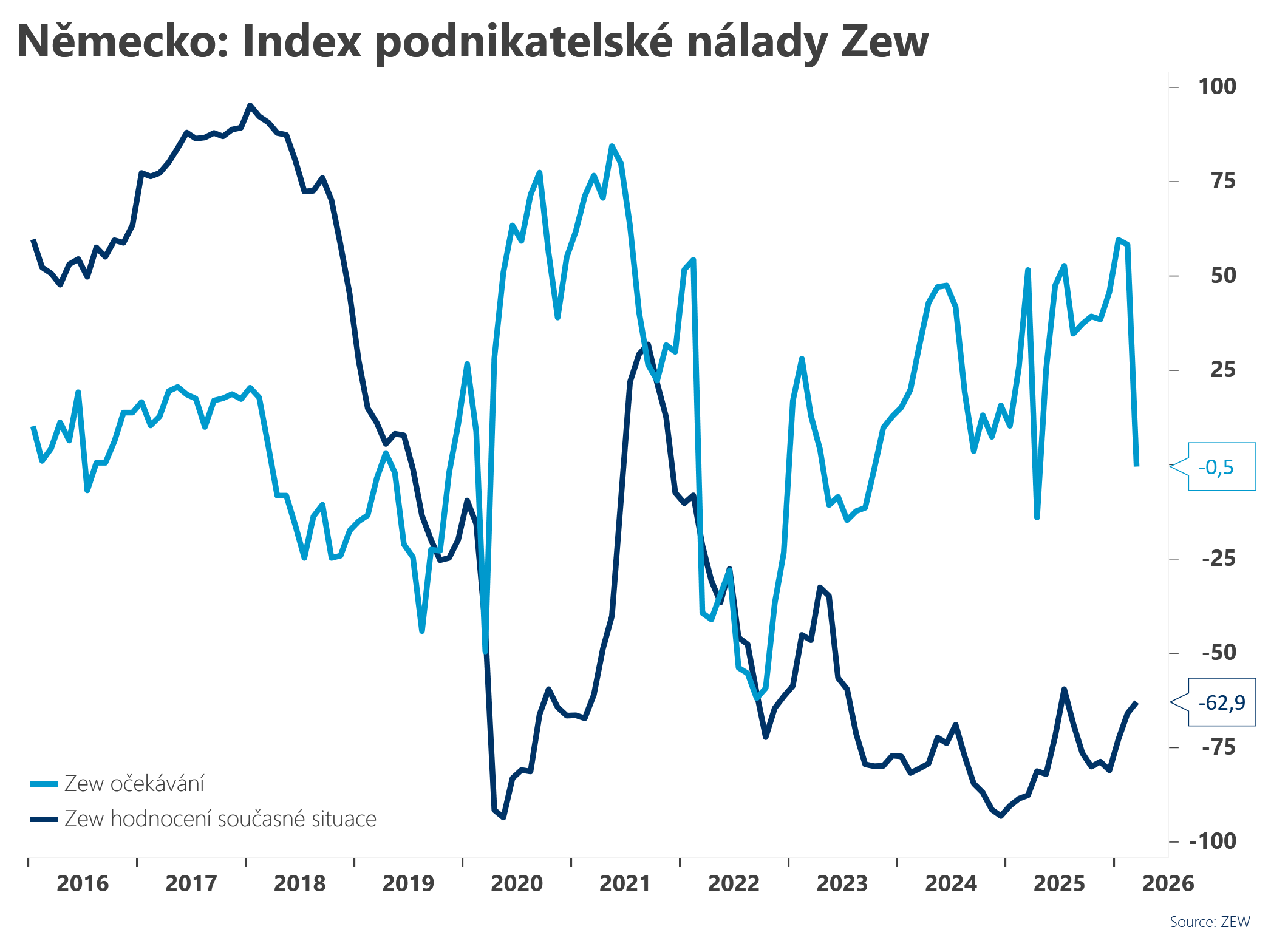 Index podnikatelské nálady Zew očekávání v lednu se snížil na 10,3 b. oproti 15,7 b. v prosinci. Trhy očekávaly snížení na 15,1 b. Index Zew hodnocení současné situace se mírně zlepšil zvýšením na -90,4 b. oproti -93,1 b. v prosinci, přičemž trhy očekávaly stagnaci na prosincové úrovni. -