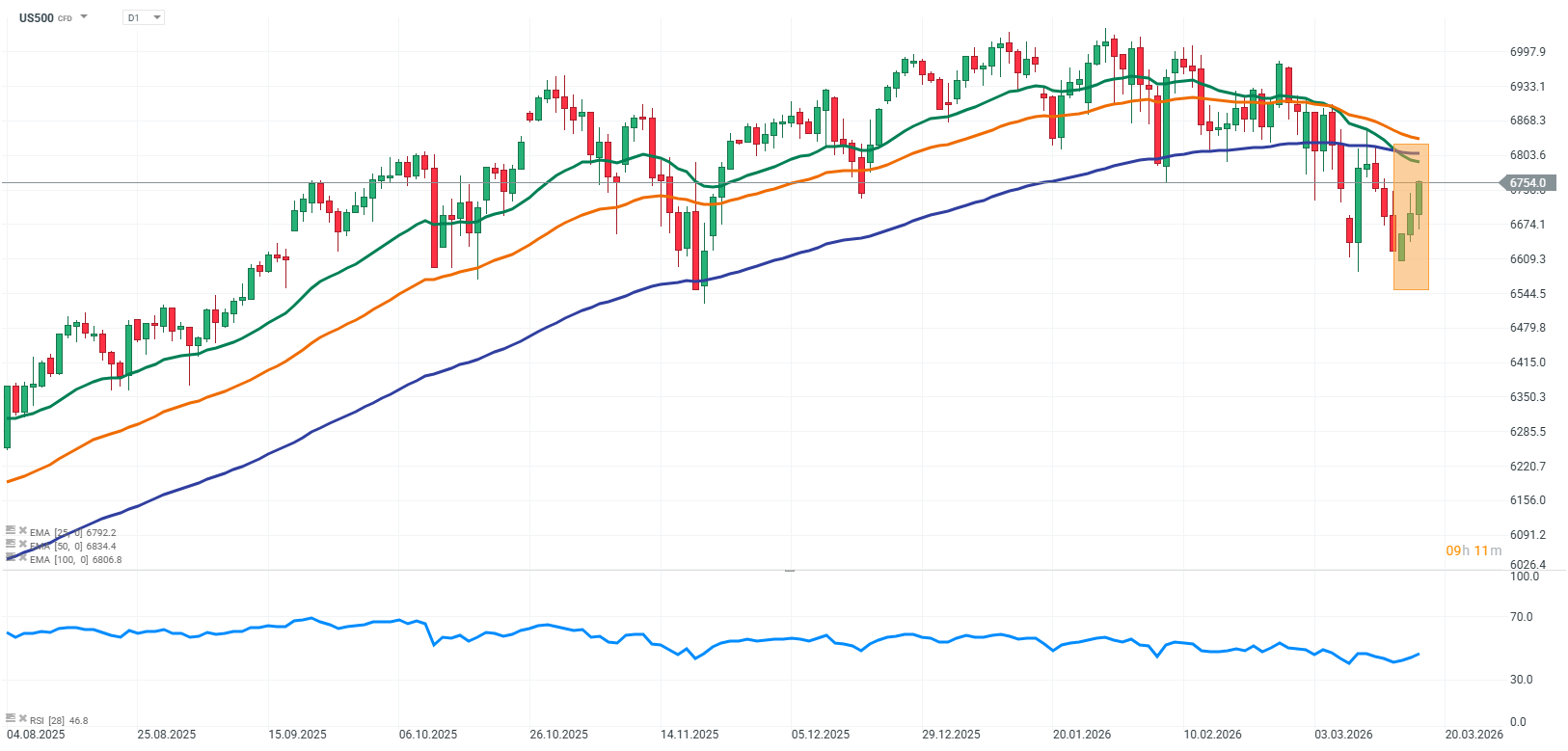 Futures na US500 (S&P 500) dnes vykazují výrazné zisky, tažené optimismem investorů. Trh předpokládá, že nejtěžší období už je za ním, a neočekává další eskalaci konfliktu na Blízkém východě. Pozitivní sentiment podporují také „úniky“ informací o pokroku v jednáních mezi USA a Íránem.