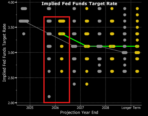 - Je třeba upozornit, že ačkoli konsenzus pro snížení sazeb v roce 2026 zůstává beze změny, méně členů FOMC jej nyní signalizuje.