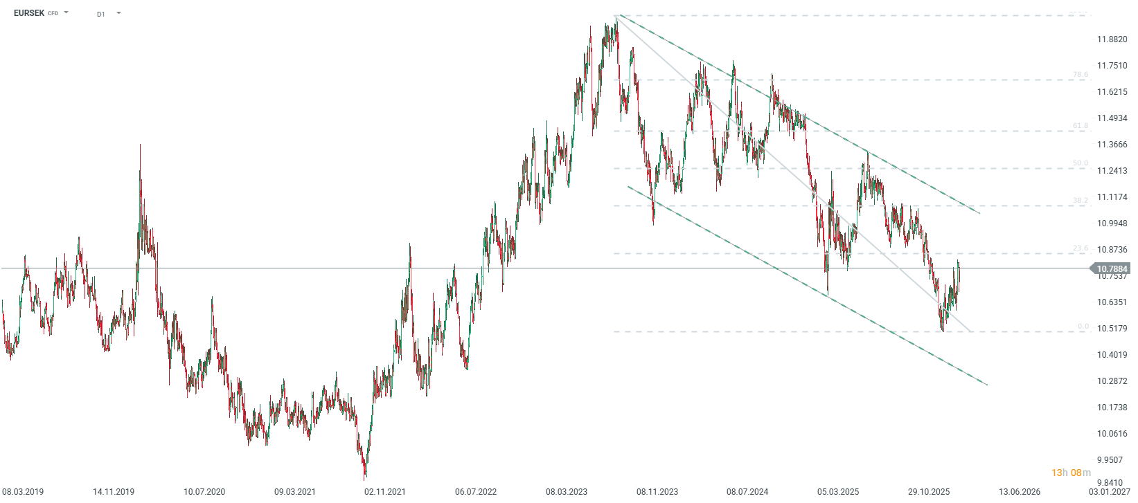 Kurz EUR/SEK se drží na relativně nízké úrovni, avšak rok 2022 znamenal začátek vlny oslabování švédské koruny vůči euru v období, kdy došlo k prudkému nárůstu cen ropy a zemního plynu. Je možné, že ECB zvýší úrokové sazby rychleji než Riksbank, což by mohlo posunout výhled směrem nahoru. Zdroj: xStation5