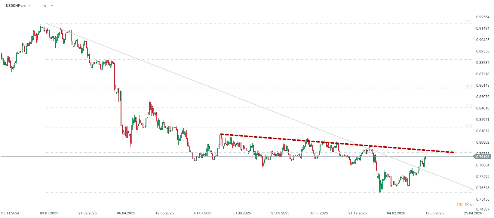 Navzdory svému postavení bezpečného přístavu začíná švýcarský frank vůči americkému dolaru ztrácet půdu pod nohama. Tento měnový pár však naráží na silný odpor na úrovni 0,80. Zdroj: xStation5