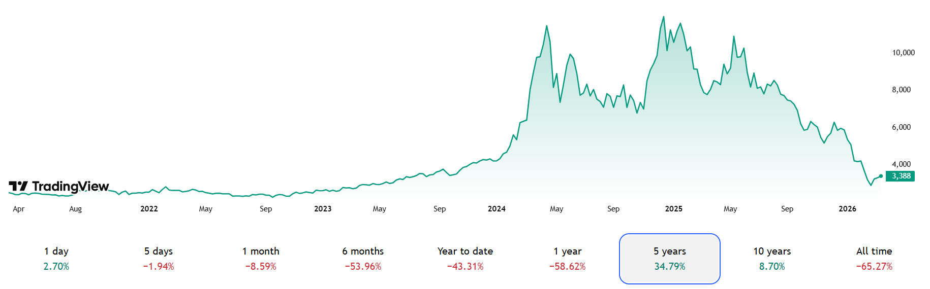 Během roku 2024 ceny kakaa vzrostly na historická maxima a v určitém momentu dokonce přesáhly hranici 12 000 USD za tunu. Od té doby se situace dramaticky změnila a ceny postupně klesly pod úroveň 4 000 USD. Jen od začátku roku kakao ztratilo více než 43 % a k 16. březnu 2026 se cena průběžných kontraktů CC1 na americké burze ICE futures pohybovala na úrovni 3 396 USD. Při pohledu na roční graf byly kontrakty ve ztrátě 58 %. V zelených číslech byly však z 5letého pohledu a to 35 %. Prudký pokles cen potvrzují i zprávy z finančních trhů, podle kterých kakao dosáhlo víceletých minim na londýnské i newyorské burze.