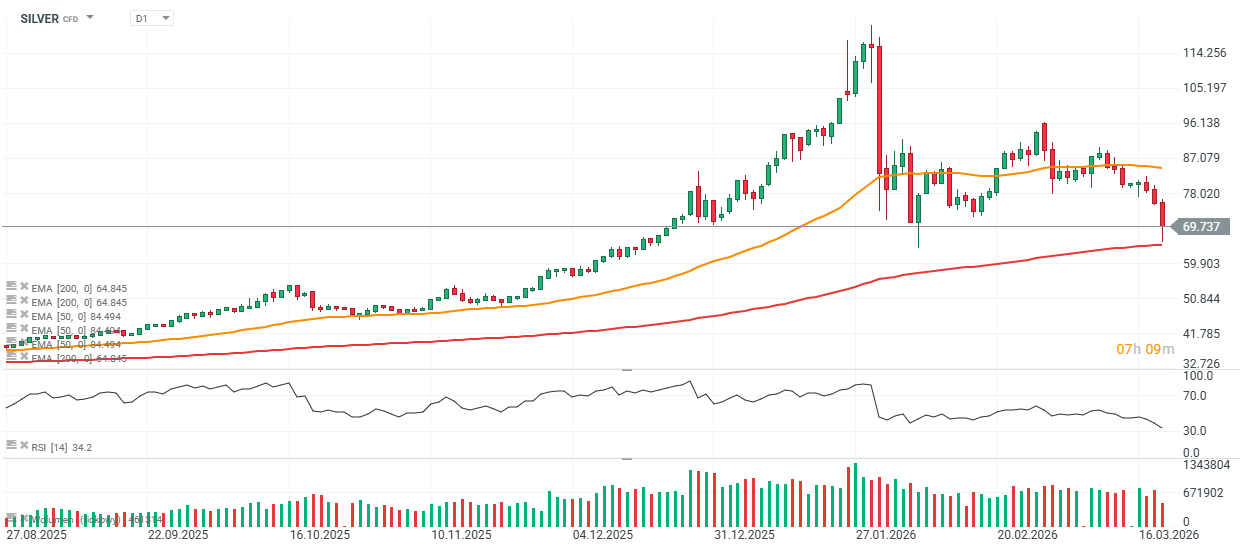 Trh s drahými kovy v posledních dnech zažil mimořádně silný výprodej. Zlato na týdenní bázi ztrácí přibližně 10 % a směřuje k nejhoršímu týdnu od roku 1983, zatímco stříbro dnes kleslo o více než 10 %, než se odrazilo po „dotyku“ klíčového supportu poblíž svého 200denního klouzavého průměru.