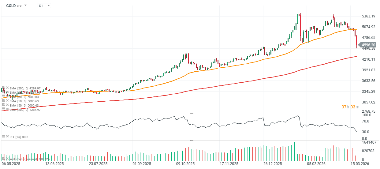 U zlata cena reagovala na support na EMA200 (červená linie) i v předchozí výprodejové zóně z konce ledna a začátku února, tedy v oblasti kolem 4 500 USD za unci. Odraz ze současných úrovní by mohl otevřít cestu k testu 5 000 USD za unci, zatímco hlubší korekce by mohla stáhnout cenu blíže ke 4 000 USD, kde byly na podzim 2025 patrné silné cenové reakce.