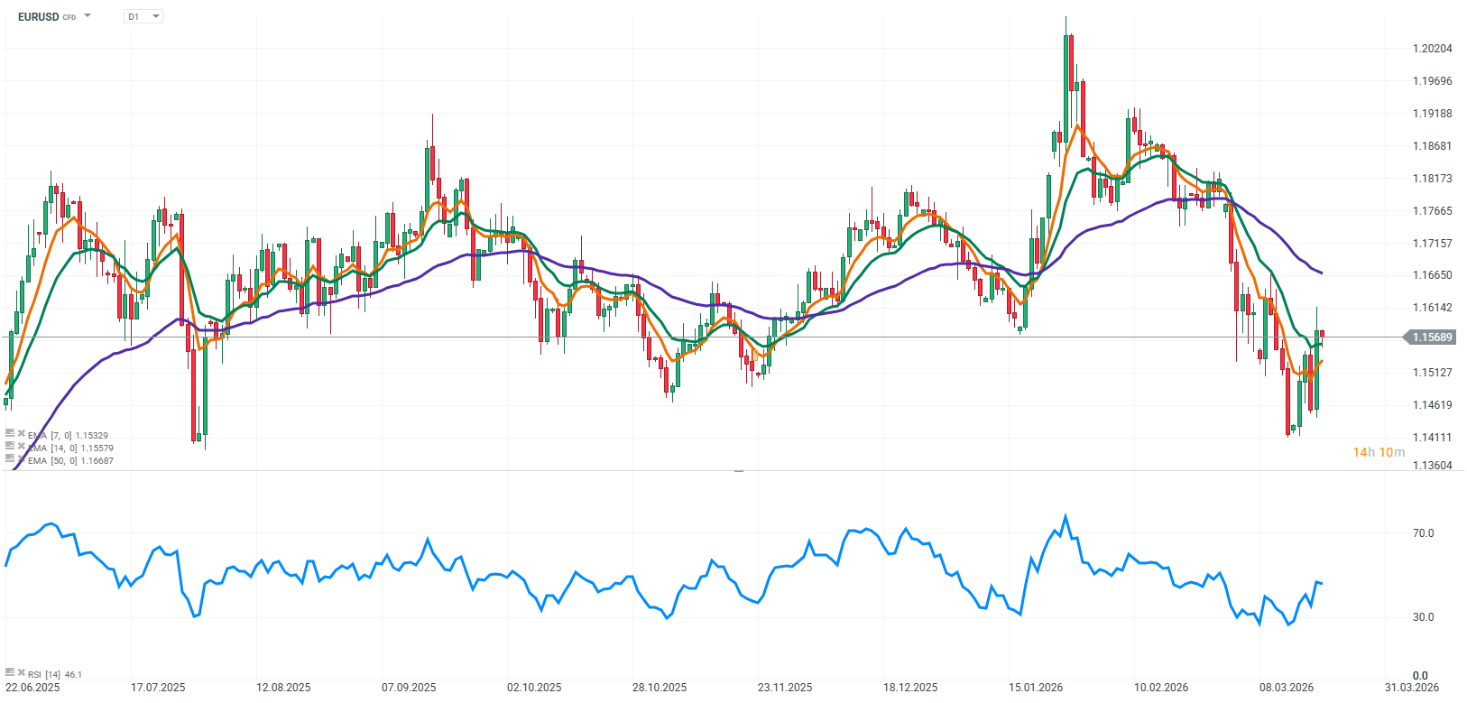 - EURUSD zůstává citlivý na měnovou politiku, geopolitické napětí a volatilitu cen energií. Silný americký dolar, eskalace konfliktu na Blízkém východě a omezené inflační impulzy v eurozóně drží měnový pár pod tlakem.