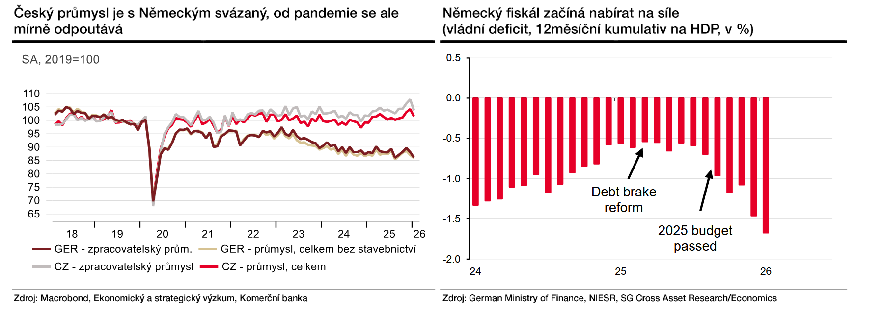 Klíčová slova: HDP | Německo | Rizika | Hospodářství | ECB | Ekonomika | Investice | Německá ekonomika | Komerční banka | Ozvěny trhu | Financování | Banka | Société Générale | Trh | Firmy | České firmy | Stagnace | Podniky | Geopolitika | Český průmysl | Digitalizace | Trh práce | Miliardy | Průmysl | Jan Vejmělek | Impuls | Růstový impuls | Nejistoty | Měnové politiky | Zpřísnění měnové politiky | Evropské ekonomiky | Situace | Stimul | Růst | Potenciál | Ekonomiky | Práce | Fiskální impuls | Výdajový balík | Německé ekonomiky | Německé investice | Demografické trendy | Investice do obrany | Investice do obrany a infrastruktury | NIM | Rok 2026 |