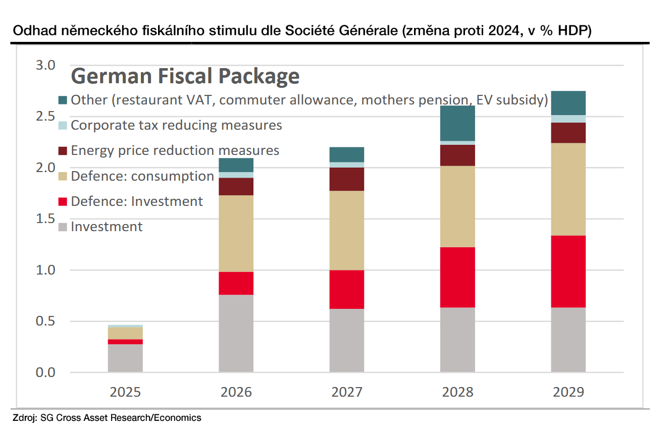 Česko z tohoto hlediska stojí v první řadě. Mezi evropskými ekonomikami patří nadále k nejvíce provázaným s Německem: nejen exportem hotových výrobků, ale i robustními dodavatelskými řetězci, a to hlavně v automobilovém průmyslu, strojírenství či elektrotechnice. Podle odhadů ekonomů Société Générale může německý stimul v prvních dvou letech zvýšit růst ostatních zemí eurozóny o 0,25 až 0,5 procentního bodu, u střední Evropy bychom se mohli nacházet spíše u horní hrany uvedeného pásma. U českých firem se pak efekty mohou projevit rychleji než jinde.