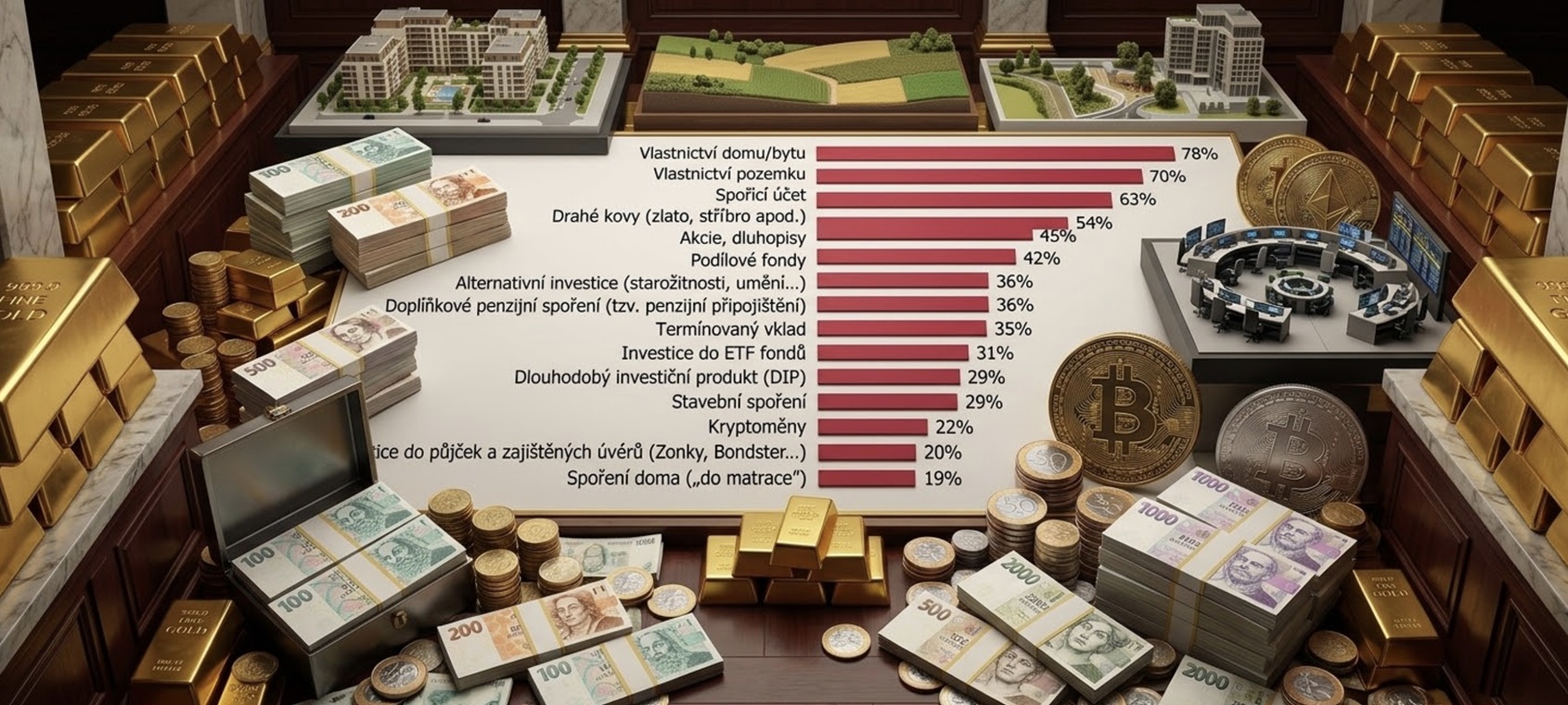Nejzajímavější možností investování nebo spoření peněz je podle 80 procent Čechů vlastnictví domu nebo bytu, na druhém místě je vlastnictví pozemku (72 procent) a na třetím místě je spořicí konto (54 procent). Následují investice do drahých kovů, které jsou atraktivní pro 49 procent Čechů. -