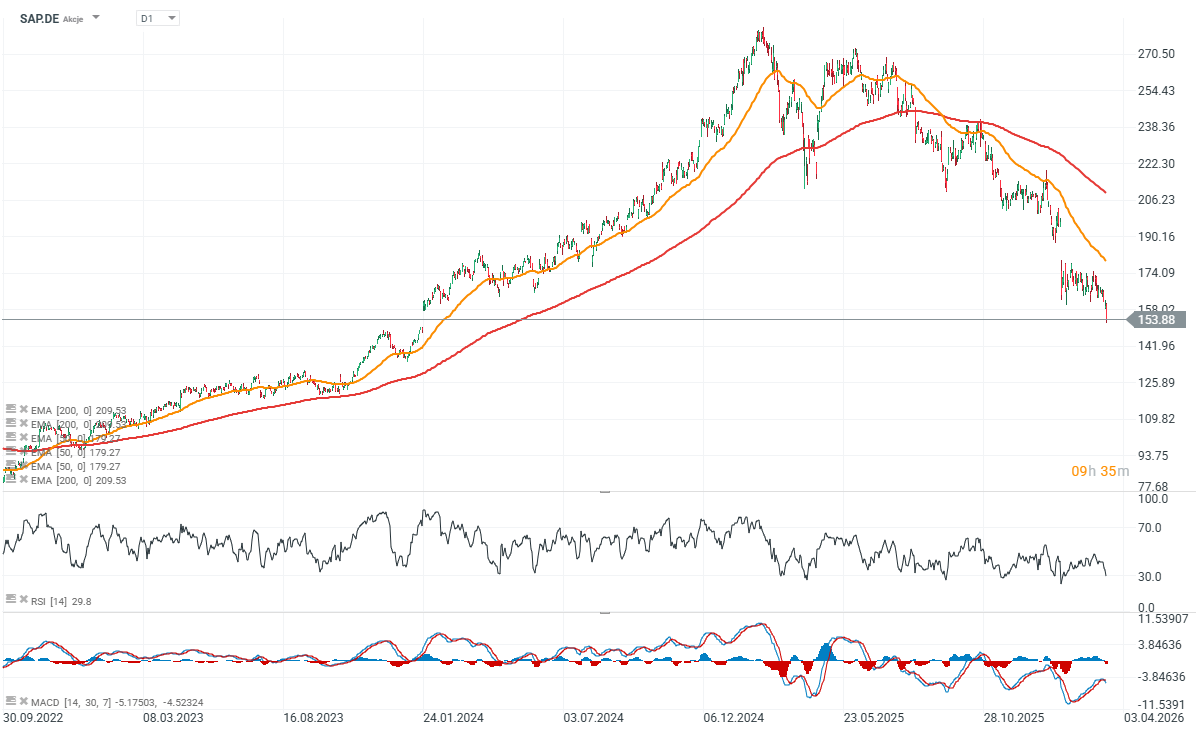 - SAP také těží z vysokých nákladů na přechod ke konkurenci a z dlouhodobých vztahů s podnikovými zákazníky, které posilují její konkurenční pozici na trhu. Zároveň však společnost nedávno zveřejnila výsledky za 4. čtvrtletí 2025, které zaostaly za očekáváním analytiků.
