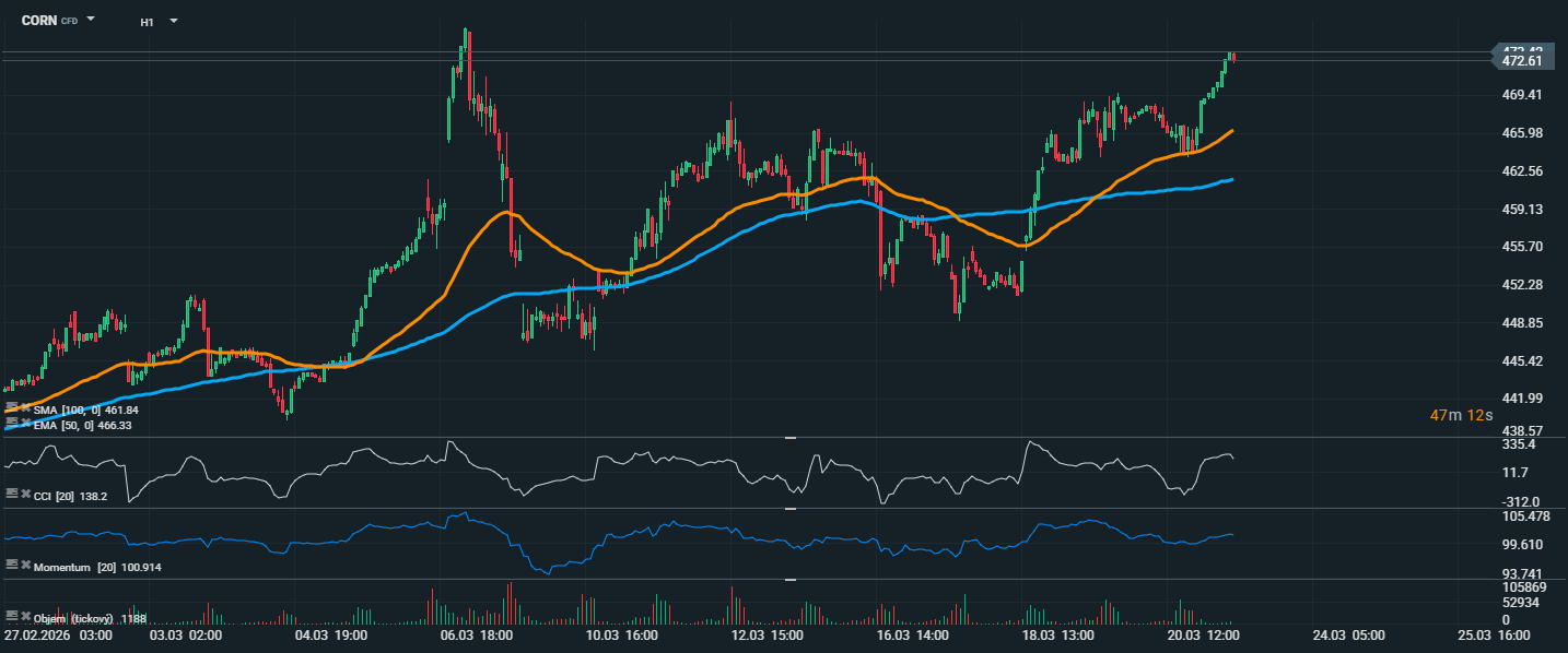 Cena kukuřice se vyšplhala k úrovni 472,61, což představuje nejvyšší hodnoty za poslední sledované období a potvrzuje pokračující krátkodobý růstový trend. Trh se zároveň drží nad oběma klouzavými průměry, když EMA 50 leží na 466,33 a SMA 100 na 461,84. Toto nastavení ukazuje, že kupci mají nadále převahu a dosavadní růst si udržuje solidní technický základ. Pozitivní obrázek podporuje také CCI, který se pohybuje na zvýšených hodnotách kolem 138, což potvrzuje silné nákupní momentum, ale zároveň už naznačuje i možnost krátkodobého přehřátí trhu. Momentum se drží nad neutrální hladinou na úrovni přibližně 100,9, čímž dál potvrzuje sílu aktuálního pohybu.