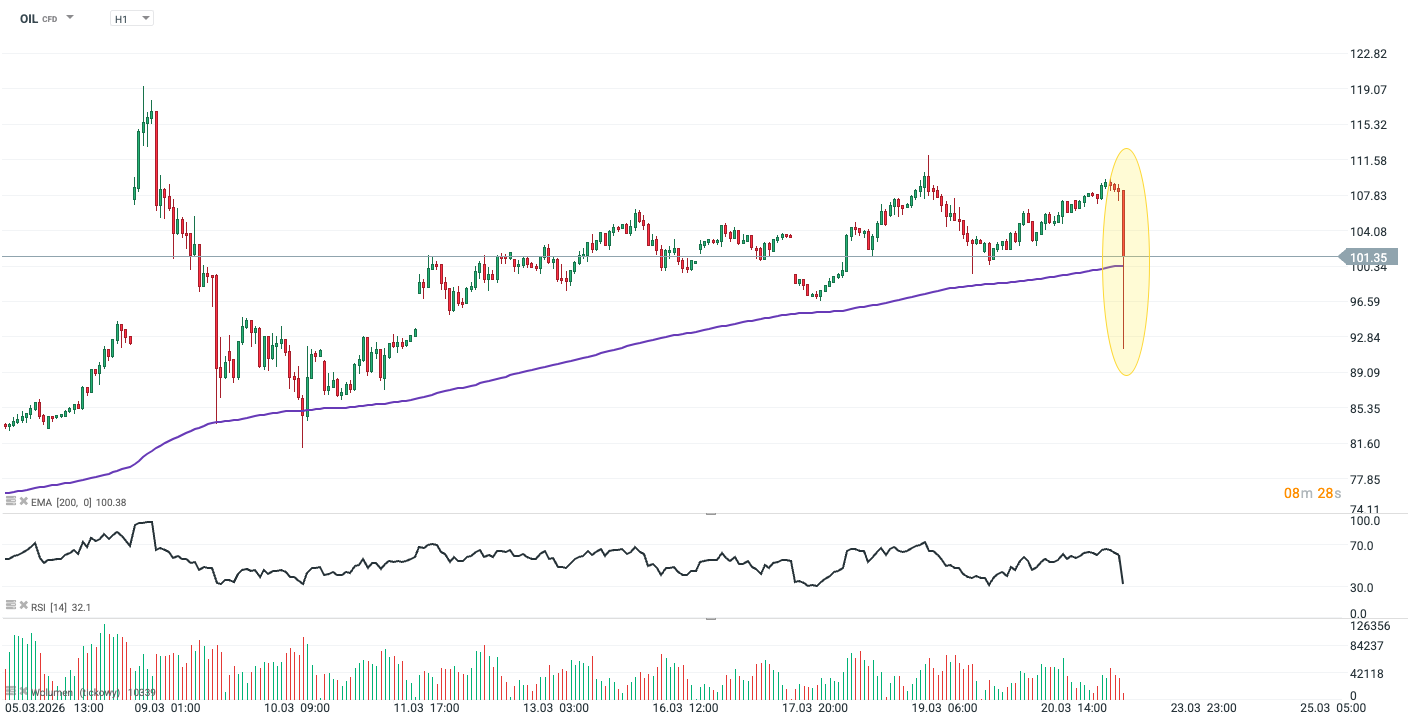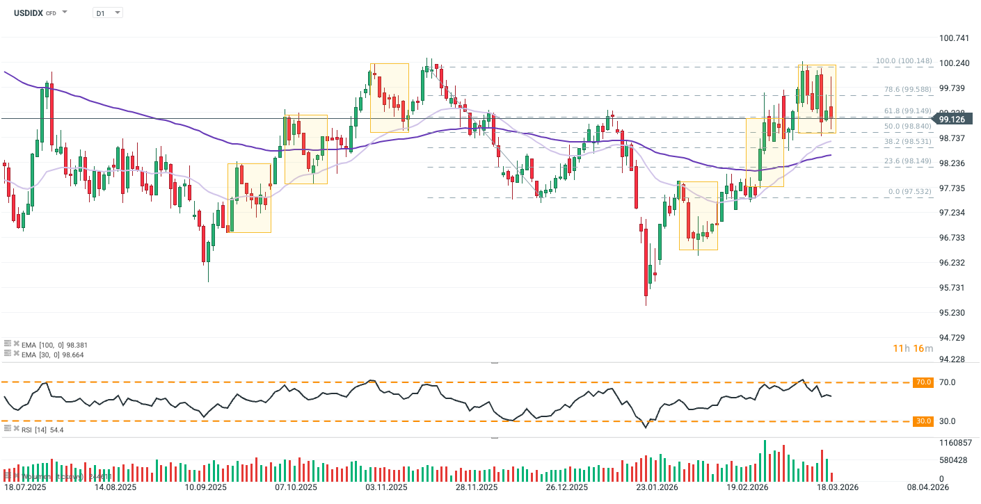 Dolarový index prudce obrací směr (USDIDX: -0,6 %) v reakci na prohlášení Donalda Trumpa, že nařídil odložení všech útoků na íránskou energetickou infrastrukturu na následujících pět dní. Americký prezident ve svém vyjádření dodal, že během posledních dvou dnů vedly obě strany konfliktu produktivní jednání o možném zastavení operací.