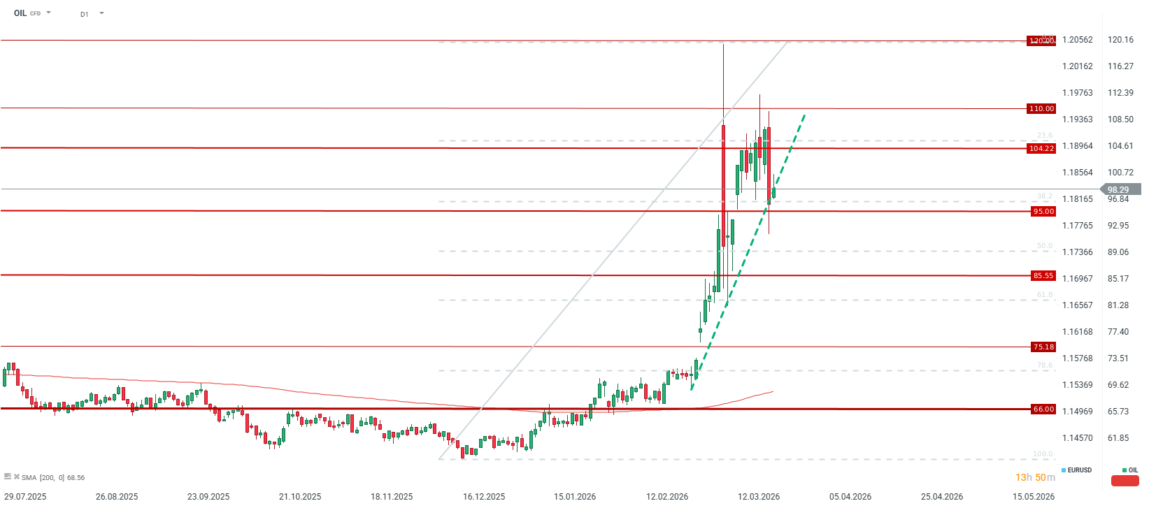 Z technického pohledu zůstává klíčový support na úrovni 95 USD za barel nadále zachován, přičemž se tato hladina zároveň shoduje s Fibonacciho retracementem 38,2 %. V minulosti právě tato úroveň sloužila jako místo výrazných cenových reakcí. Prozatím také zůstává neproražená trendová linie uptrendu, vedená od minim z konce února a od 10. ledna.