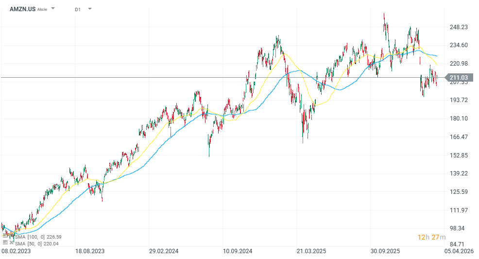 Akcie Amazonu za posledních 12 měsíců jdou spíše do strany a za poslední rok přidaly pouze 3 %. Nejvyšších hodnot Amazon dosáhl v listopadu 2025, kdy se akcie dostaly nad hranici 250 USD. Akcie tak v současnosti ztrácejí od svých maxim 17 %.