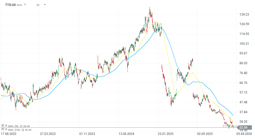 Akcie TTD se aktuálně obchodují za 22 USD, přičemž od svých maxim ztratily již více než 80 %. Od začátku roku akcie TTD ztratily přibližně 40 %, za posledních 12 měsíců jde o pokles okolo 64 %. Podobnou velkou korekcí si akcie prošly již na konci roku 2021, kdy odepsaly více než 60 %, nicméně následně se dokázaly vrátit zpět a stabilizovat.