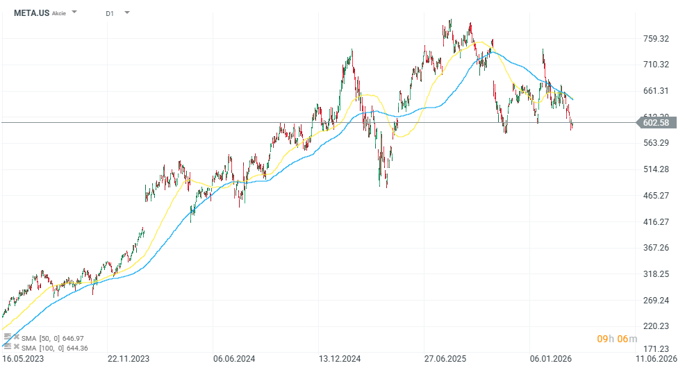 Cena akcií Meta za poslední rok klesla o 4 %, čímž zaostala za všemi ostatními technologickými giganty s vysokou tržní kapitalizací kromě Microsoftu, který oslabil o 5 %. Společnost Alphabet mezitím za poslední rok vzrostla o téměř 70 %. Aktuálně se cena pohybuje kolem hranice 600 USD, přičemž ze svých maxim v roce 2025 vyklesala již o téměř 25 %.
