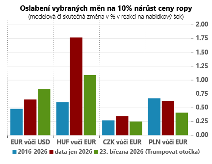 Klíčová slova: Středoevropské měny | Ceny ropy | Elasticita | Kurz | Měny | Americký prezident | Kurz koruny | ČSOB | Ropy | Volatility | Propad | Prezident Trump | Trump | Prezident | Masivní propad | Propad ceny ropy | Propad ceny | JDE | Ceny | 3М | Rok 2026 | Ropné šoky |