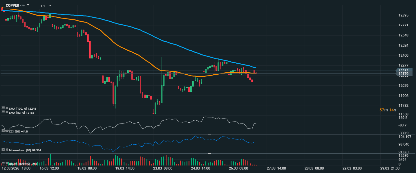Cena mědi se aktuálně pohybuje kolem 12 179 USD, tedy těsně pod EMA 50 na úrovni 12 183 USD a zároveň výrazněji pod SMA 100 na hodnotě 12 248 USD. To naznačuje, že krátkodobý růstový pokus zatím ztrácí sílu a trh zůstává v opatrném až negativním technickém nastavení. Vývoj v posledních hodinách ukazuje, že měď nedokázala udržet růst směrem k delšímu klouzavému průměru a od rezistenční oblasti kolem 12 210 až 12 250 USD se opět stáhla níže. CCI se nachází na hodnotě kolem -44, což potvrzuje ochlazení nákupního momenta, ale zatím neukazuje výrazně přeprodaný stav. Momentum se drží pod neutrální hranicí 100, konkrétně kolem 99,36, což podporuje scénář slabšího trhu.