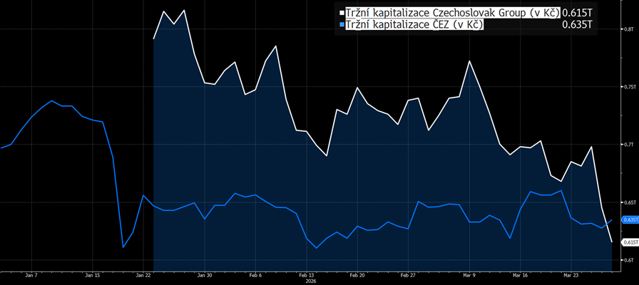 Zatímco ještě včera Czechslovak Group vykazovala uzavírací tržní kapitalizaci na pražské burze, kde se s jejím akciemi obchoduje též, ve výši 645 miliard korun, nyní už tato kapitalizace činí jen 615 miliard korun. Akcie energetické společnosti ČEZ včera vykazovaly uzavírací tržní kapitalizaci zhruba 627 miliard korun, dnes to ovšem už je takřka 635 miliard korun. ČEZ se tak dnes opět stává tuzemskou nejhodnotnější burzovně obchodovanou firmou (viz graf níže). Z této pozice jej vystrnadila právě Czechoslovak Group, když před více než dvěma měsíci úspěšně vstoupila na burzu. Od té doby však ztratila zhruba 200 miliard korun své tržní hodnoty. Vždyť letos 28. ledna, čtvrtý den burzovního obchodování, činila její uzavírací tržní kapitalizace na pražské burze 816 miliard korun, tedy o 201 miliardy více než dnes.
