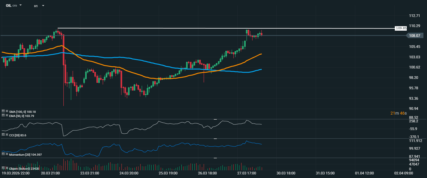 Cena ropy se vrátila do výrazně býčího nastavení a aktuálně se pohybuje kolem 108,07 USD. Trh se po předchozí volatilitě stabilizoval a během posledních seancí předvedl silný růstový impuls, díky kterému se dostal výrazně nad EMA 50 na úrovni 103,79 USD i nad SMA 100 kolem 100,18 USD. To potvrzuje obnovenou převahu kupců a zlepšení krátkodobého technického obrazu. Aktuálně je velmi důležitá rezistenční zóna v okolí 109,85 USD, kterou cena opět testuje. Právě tato hladina zatím brání pokračování růstu a trh zde krátkodobě konsoliduje po prudkém posunu vzhůru. CCI se drží poblíž hodnoty 83,6, což ukazuje na stále silné momentum, i když už trh vstupuje do zvýšeně napjaté oblasti. Také Momentum na úrovni 104,6 potvrzuje, že kupci mají situaci nadále pod kontrolou, přesto je patrné mírné zpomalení růstové dynamiky.