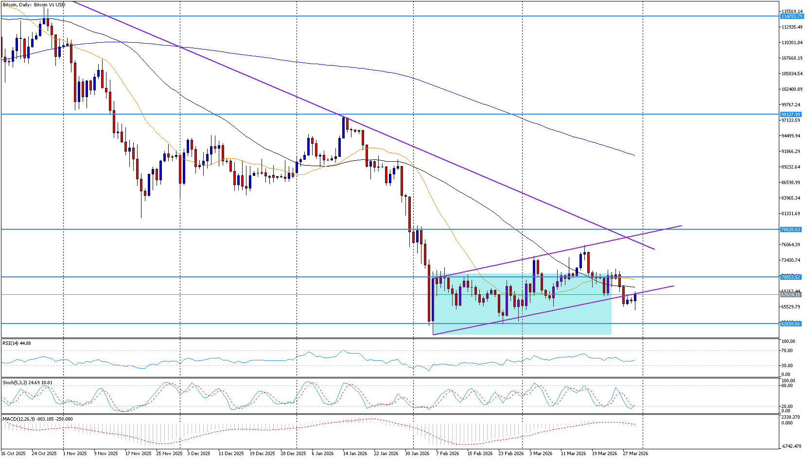 Bitcoin se pokouší o stabilizaci a mírné oživení poté, co během nedávného poklesu dosáhl měsíčního minima těsně pod hranicí 65 000. Následný návrat nad tuto úroveň umožnil částečné vymazání ztrát a aktuálně se cena pohybuje poblíž 67 600, přičemž se snaží znovu vstoupit do několikaměsíčního vzestupného kanálu, který zůstává aktivní od začátku února. Tento pohyb však zatím působí spíše jako korekce než jako začátek nového růstového trendu. Technické indikátory naznačují opatrné zlepšení, avšak bez jasného potvrzení býčího obratu. MACD zůstává v negativním teritoriu, přičemž jeho histogram se postupně zmenšuje a pohybuje se těsně nad signální linií, což signalizuje zpomalování sestupného momenta. RSI zároveň roste z hodnot pod neutrální hranicí 50, což poukazuje na určité zlepšení sentimentu, nicméně zatím bez dostatečné síly pro výraznější změnu trendu. Z hlediska klíčových technických úrovní bude zásadní, zda se ceně podaří překonat první bariéru ve formě rezistence na 50denním jednoduchém klouzavém průměru kolem 68 931. Nad touto úrovní se nachází další překážka v podobě 20denního SMA poblíž 70 120, která společně s předchozí rezistencí vytváří významnou zónu bránící dalšímu růstu. Pokud by se kupcům podařilo tuto oblast překonat, další cíle by se nacházely na 71 500 a následně na horní hranici širšího pásma kolem 74 471. Naopak v případě obnovení prodejního tlaku zůstává klíčovou podporou oblast 65 400. Její prolomení by mohlo otevřít cestu k dolní hranici konsolidačního pásma na 62 500. Níže se nachází psychologicky významná úroveň 60 000, která zároveň představuje patnáctiměsíční minimum a potenciální bod zvýšeného zájmu kupců. Celkově se bitcoin aktuálně pohybuje u spodní hranice širšího bočního pásma, které v posledních týdnech omezuje cenový vývoj a je doprovázeno formováním nižších maxim. Tento strukturální prvek udržuje krátkodobý medvědí tón beze změny. Nedávné růstové pohyby zatím působí jako technické korekce, přičemž klíčová rezistenční zóna kolem 70 000, definovaná 20denním a 50denním SMA, nadále představuje hlavní překážku pro výraznější obrat směrem vzhůru.