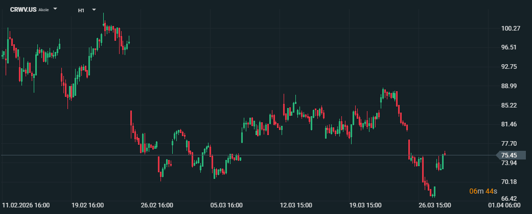 Akcie CoreWeave (CRWV) v pátek 27. února 2026 během dne klesaly o více než ~17 %, když trh vstřebával plán firmy více než zdvojnásobit kapitálové výdaje. Investoři řeší hlavně dopad na marže a otázku, jak bude „neocloud“ financovat tempo expanze podobné hyperscalerům. Zdroj: xStation5 -