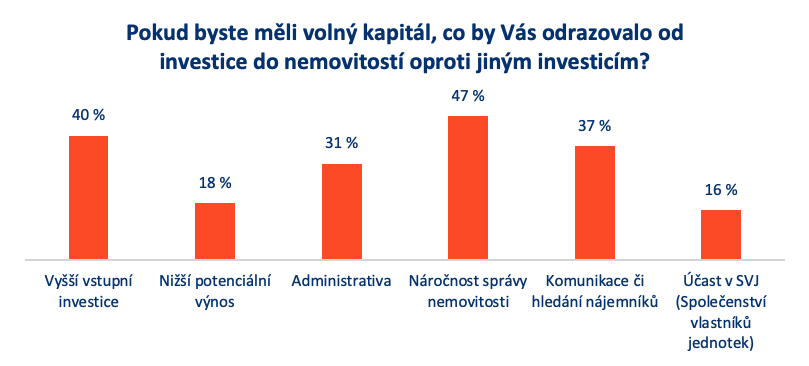 Data průzkumu odhalila, že hlavní bariérou investování do nemovitostí není nedostatek peněz, jak se často předpokládá. Největší obavy mají lidé z praktické stránky vlastnictví. Přibližně každý druhý respondent uvádí jako hlavní překážku náročnost správy nemovitosti.