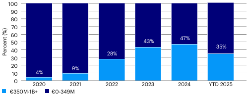 Poznámka: Rozložení evropských transakcí v oblasti přímého úvěrování podle počtu. Zdroj: PitchBook | LCD. Údaje k 31. říjnu 2025. Analýza vychází z transakcí, o nichž informoval LCD News; podíl byl vypočítán na základě transakcí, u nichž byly zveřejněny údaje o objemu.