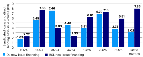 V obdobích slabé emise na trhu syndikovaných úvěrů se spready nových transakcí rozšiřují — jako tomu bylo v roce 2022–a aktivita v direct lendingu roste. Naopak při silném trhu nových emisí BSL a poklesu spreadů, jak jsme viděli v roce 2024, se mnoho firem přesouvá zpět k syndikovanému financování.