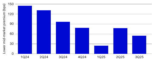 Poznámka: Větší obchody mohou nabídnout lepší výnosy očištěné o riziko. Zdroj: KBRA DLD Research, stav ke 3. čtvrtletí 2025: pouze úvěry s dobou splatnosti 1 rok; jednotná tranše (unitranche) vychází z pákového efektu: >4,0x u struktury tvořené výhradně seniorními dluhovými nástroji; segment nižší střední velikosti je definován jako EBITDA <20 mil. EUR.