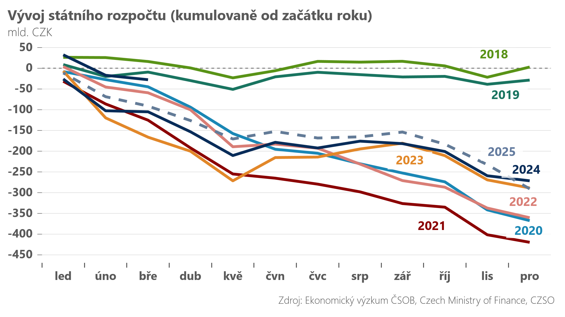 Ke konci listopadu činil schodek státního rozpočtu 232 mld. Kč, zhruba o 37 miliard méně než v minulém roce. Plnění rozpočtu se tak vyvíjí zhruba v souladu s plánovaných deficitem 241 miliard, nicméně bližší pohled do struktury ukazuje na některé problematické aspekty. -