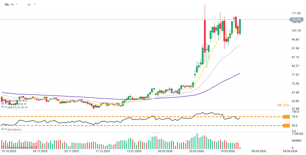 Kontrakt na OIL se dynamicky vrací nad 10denní exponenciální klouzavý průměr (EMA10, žlutě), což potvrzuje silný růstový trend. Cena se však blíží k opakovaně testované rezistenci na 110 USD a téměř překoupený RSI (blízko 70) může omezit další růst nad tuto úroveň. Zdroj: xStation5