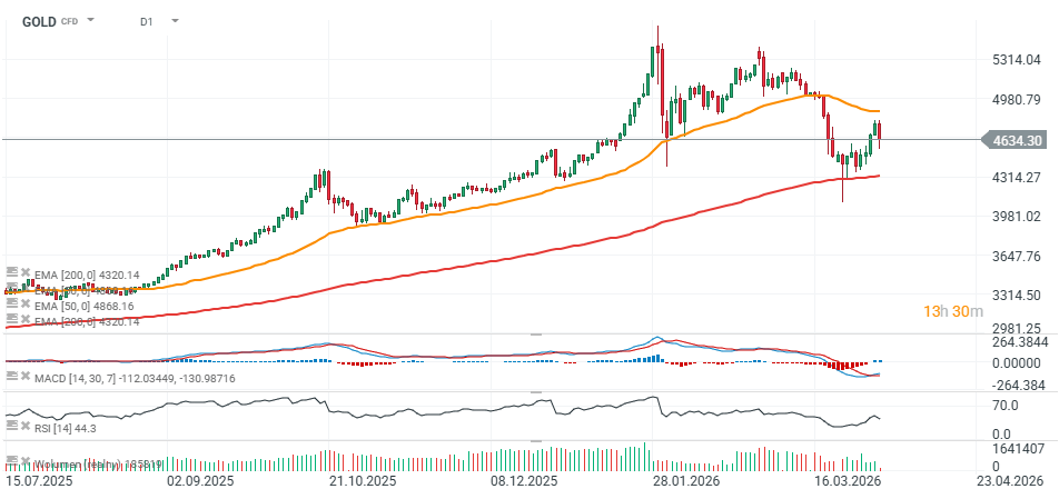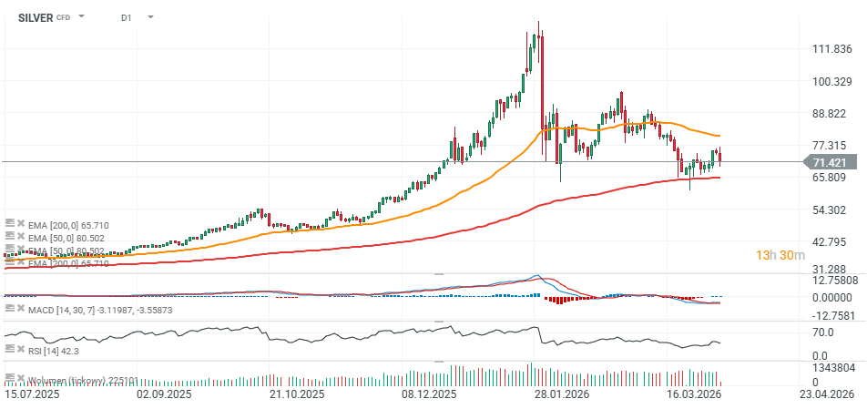 Zlato dnes ztrácí přibližně 2,5 %, zatímco stříbro oslabuje téměř o 5 %. Tento kov zůstává citlivější na ekonomické podmínky, včetně globálního průmyslového výhledu, který negativně ovlivňují narušení, jako je například možné zablokování Hormuzského průlivu.