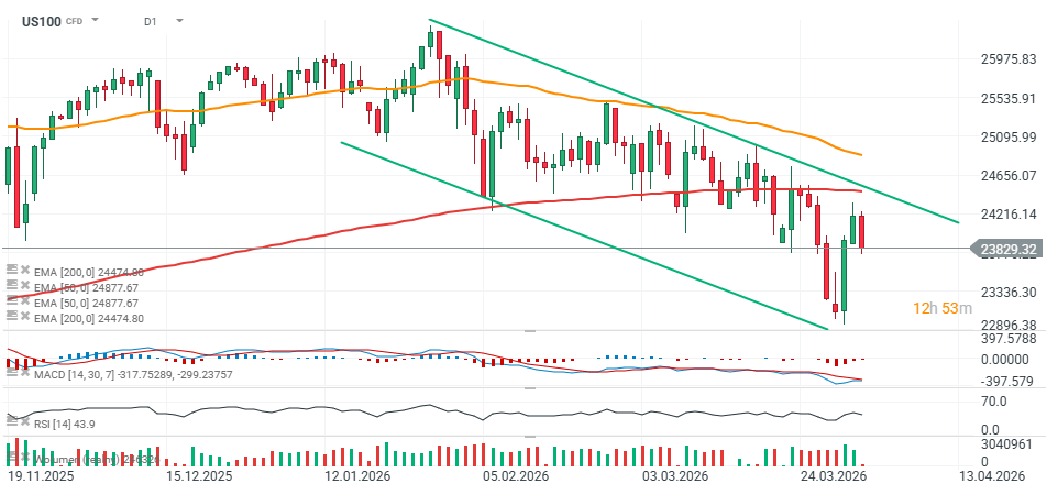 US100 se obchoduje pod EMA200, ke které se včera přiblížil. Je viditelný klesající cenový kanál, přičemž rezistence se nachází kolem úrovně 24 500. Supporty se podle metodologie price action aktuálně nacházejí poblíž úrovní 23 800 a 23 500 (horní knot pondělní svíčky).