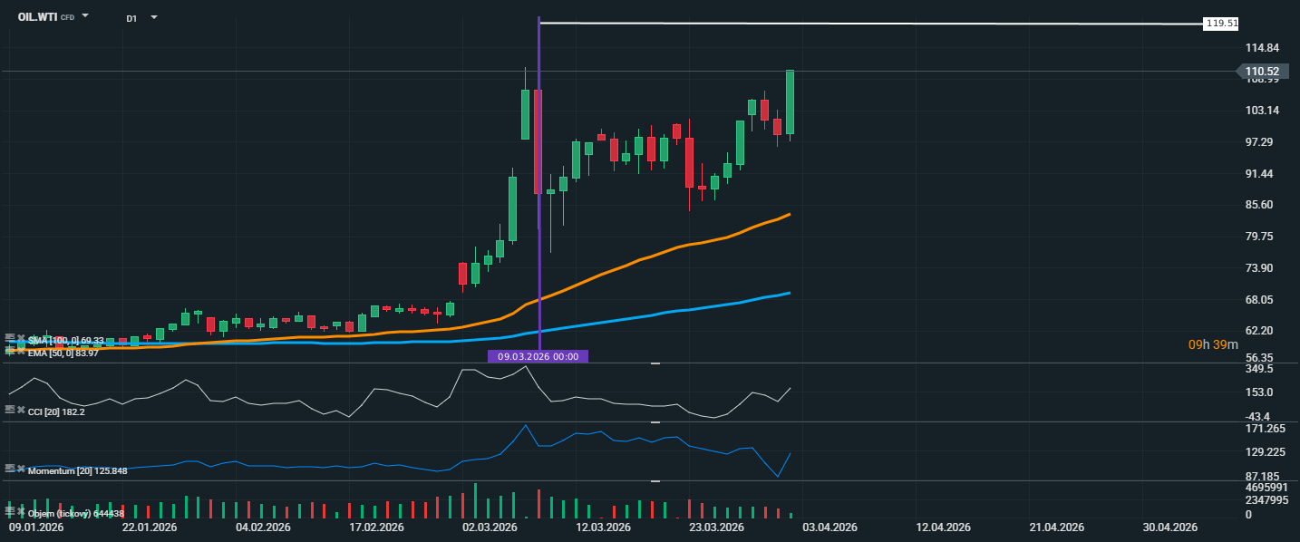 Cena ropy WTI zůstává v býčím trendu a aktuálně se pohybuje kolem 110,52 USD za barel. Po prudkém růstu z první poloviny března sice trh přešel do krátkodobé konsolidace, ale kupci si udrželi kontrolu a cena znovu míří vzhůru. Cena ropy se nadále drží výrazně nad klouzavými průměry, když EMA 50 leží na úrovni 83,97 USD a SMA 100 kolem 69,33 USD. To potvrzuje, že střednědobý i dlouhodobější trend zůstává jednoznačně růstový. CCI se pohybuje na vysoké hodnotě kolem 182,2, což ukazuje na silný růstový impuls, ale zároveň i na riziko krátkodobého přehřátí trhu. Také Momentum 125,8 zůstává výrazně nad neutrální úrovní, což potvrzuje pokračující sílu kupců po předchozí konsolidaci. Trh tak znovu nabírá dynamiku po krátké pauze.