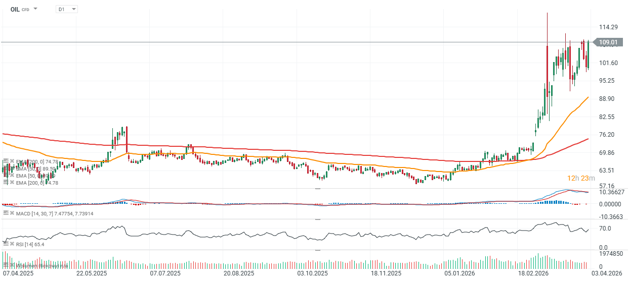 - Ropa WTI vzrostla o 11 %, zatímco globální benchmark Brent se usadil poblíž 109 USD za barel, jak ukazuje níže uvedený graf.