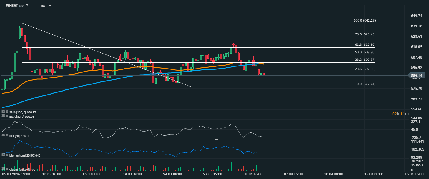 Z technického pohledu bude nyní klíčové sledovat, zda si pšenice udrží oblast kolem 577,74. Pokud by tato podpora nevydržela, mohl by se pokles ještě prohloubit. Naopak pro zlepšení sentimentu by bylo potřeba vrátit cenu zpět alespoň nad pásmo 592,96 až 602,37, kde se nachází nejen Fibonacciho úrovně, ale i oba důležité klouzavé průměry.