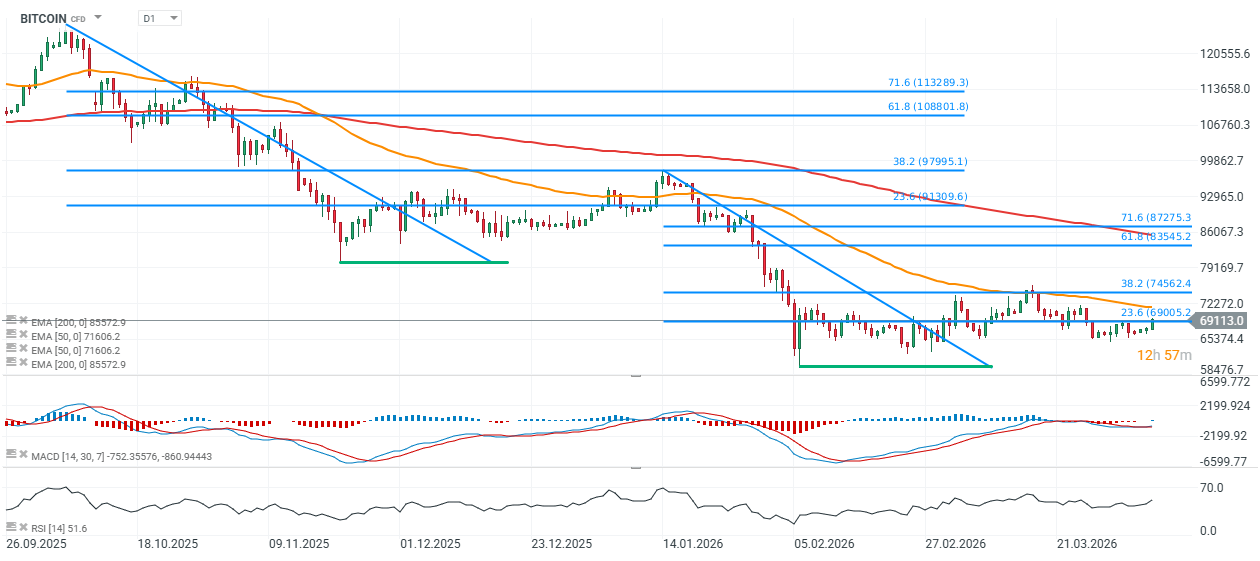 Při pohledu na poslední dva klesající cenové impulzy se BTC v obou případech choval podobně. Nyní, stejně jako na přelomu listopadu a prosince 2025, cena klesla přibližně o 10 % pod 23,6 % Fibonacciho retracementu klesajícího pohybu — dříve kolem 91 000 USD a nyní poblíž 69 000 USD. Stejně jako při předchozím pohybu se cena odrazila také od rezistence na úrovni 38,2 % Fibonacciho retracementu — dříve kolem 98 000 USD a nyní přibližně na 74 600 USD.