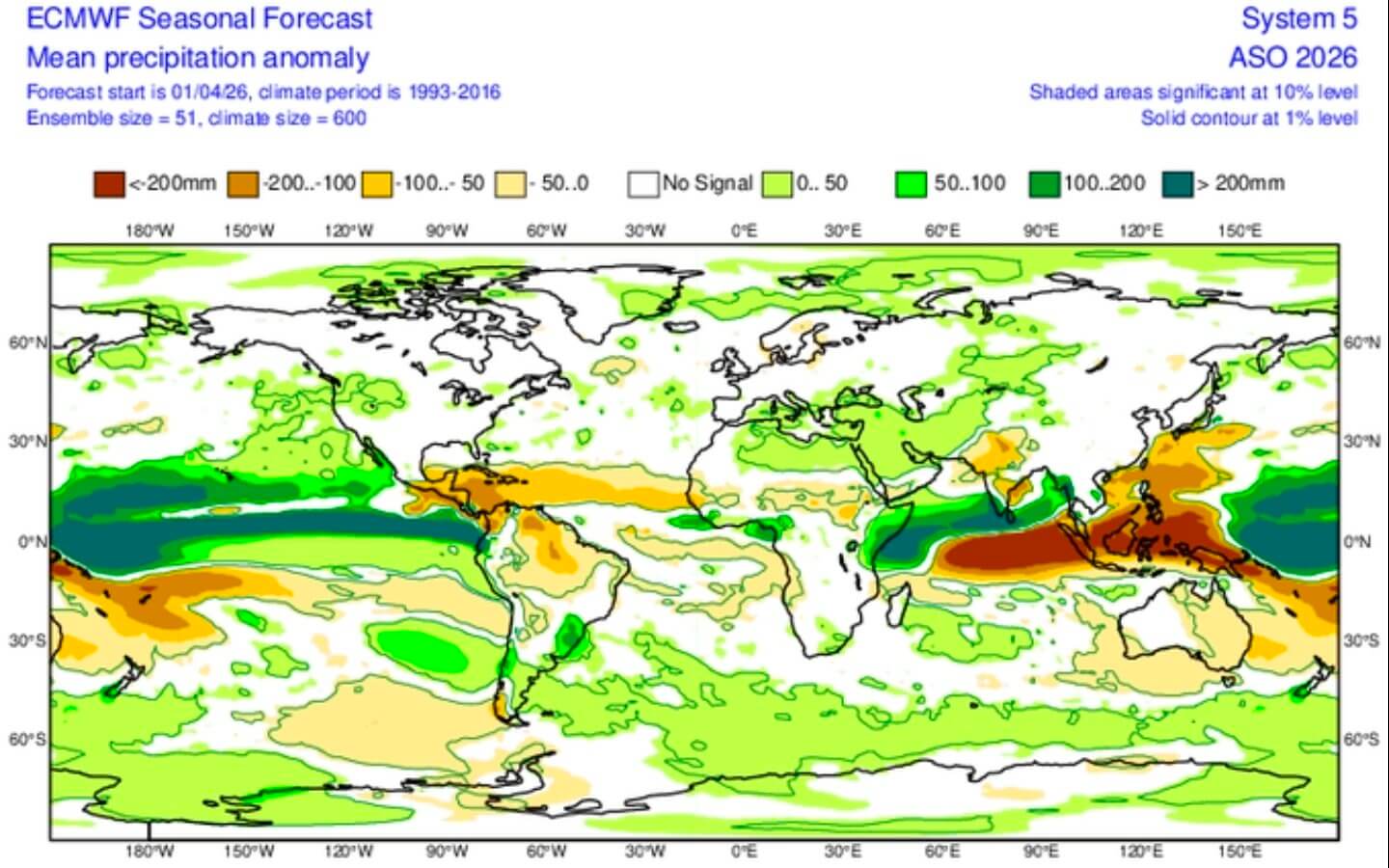 - Anomálie teplot mořské hladiny přesahující +2,0 °C napříč rovníkovým Pacifikem ukazují na široké a přetrvávající narušení atmosférické cirkulace.
