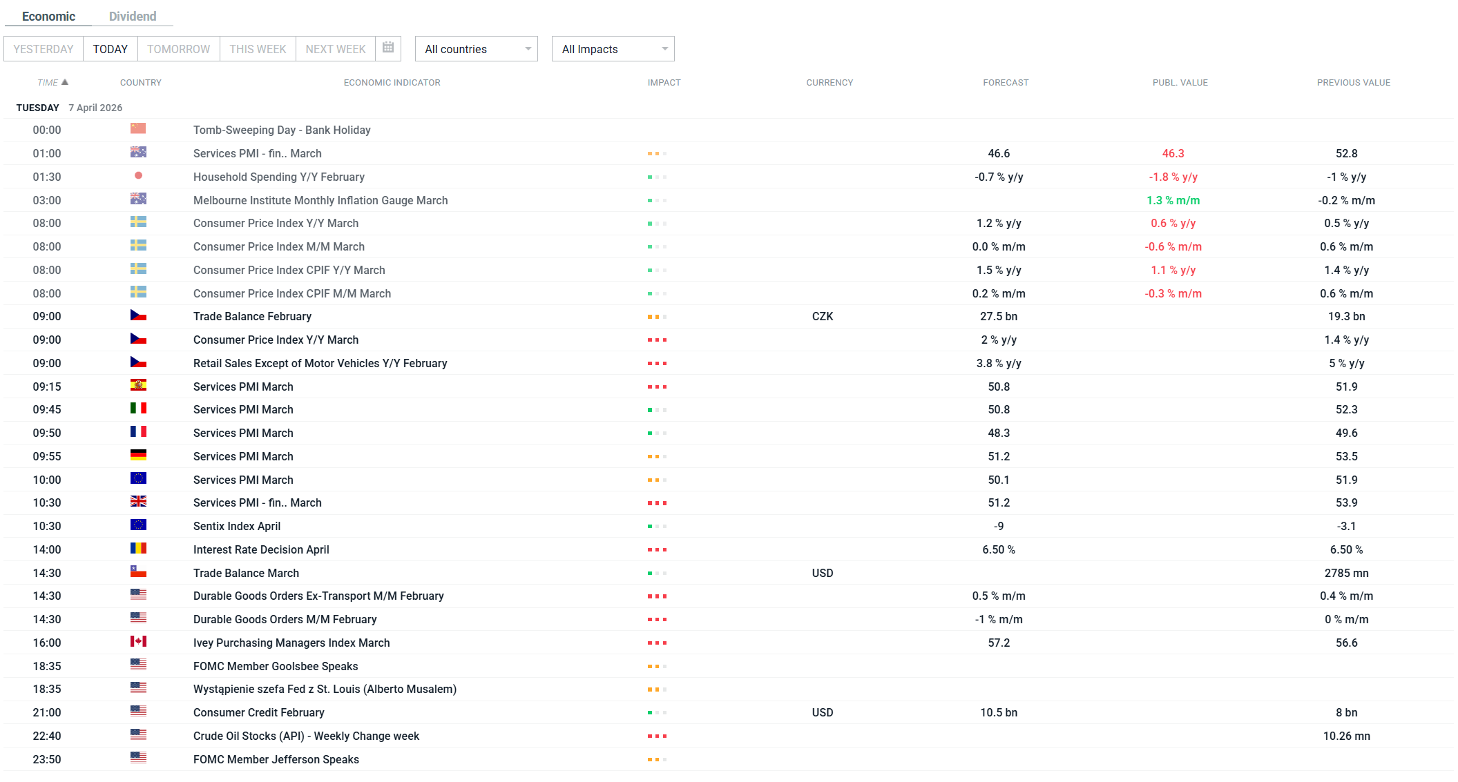 Dnešní ekonomický kalendář je i na pondělí mimořádně chudý. Jsme těsně před zveřejněním švýcarského indexu cen výrobců za březen, který pravděpodobně dodá USDCHF určitou volatilitu, na kterou silně tlačí současná honba za bezpečnou měnou tváří v tvář krizi důvěryhodnosti dolaru. Kromě toho si dnes později vyslechneme představitele Fedu a v noci obdržíme zápis z jednání RBA. -