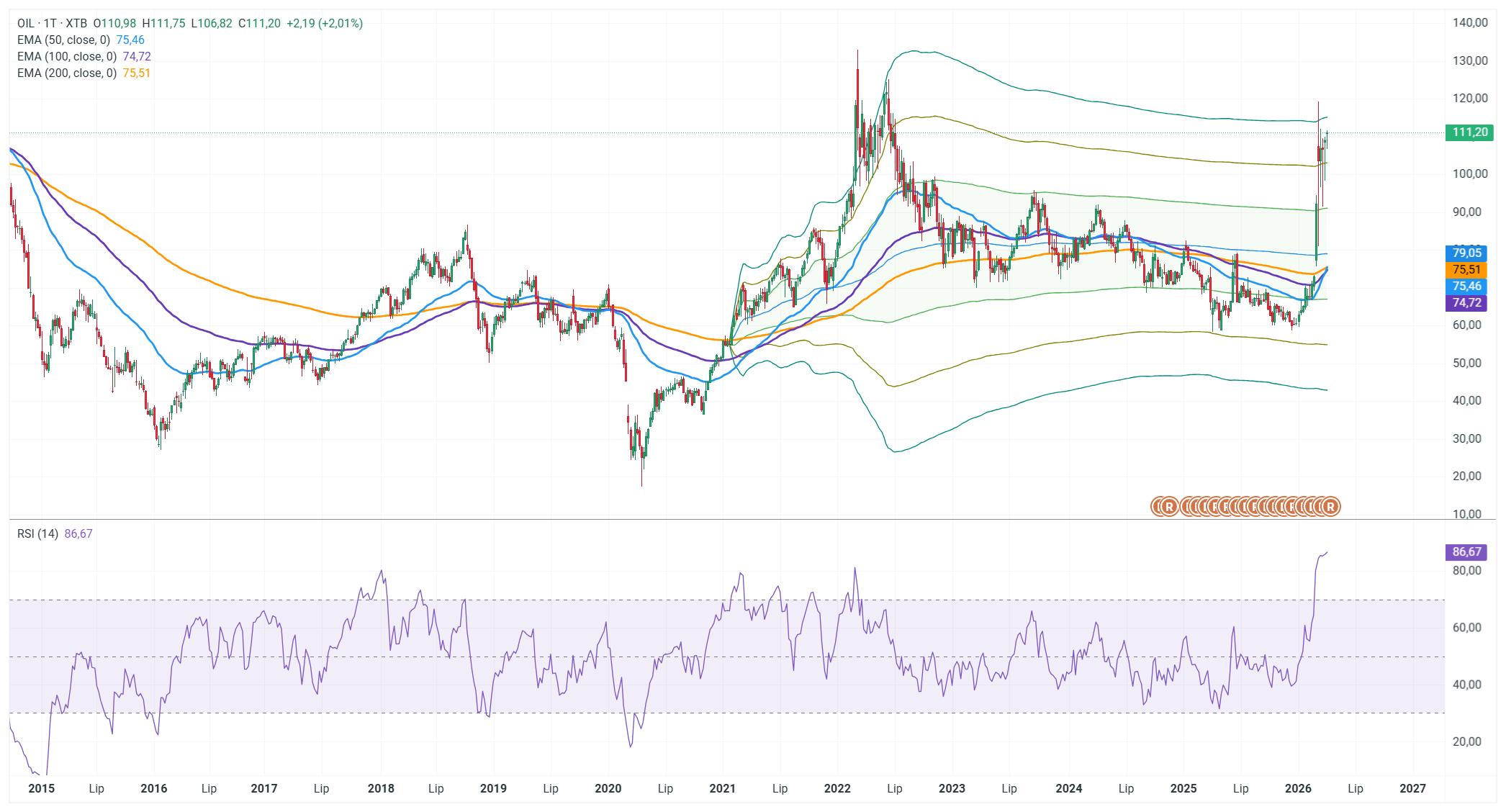Všechny tři klíčové klouzavé průměry — EMA 50, EMA 100 a EMA 200 — zůstávají soustředěné v pásmu kolem 74 až 79 USD, což znamená, že se současná cena obchoduje s prémií více než 45 % nad dlouhodobými průměry. Jde o extrémní odchylku od historické normy. RSI (14) dosahuje až 86,67, tedy úrovně překoupenosti, která jasně překonává vrcholy RSI z roku 2022. V tuto chvíli však turbulence kolem nejistého výsledku jednání mezi USA a Íránem neumožňují snížení tlaku na poptávku po této komoditě. Zdroj:xStation