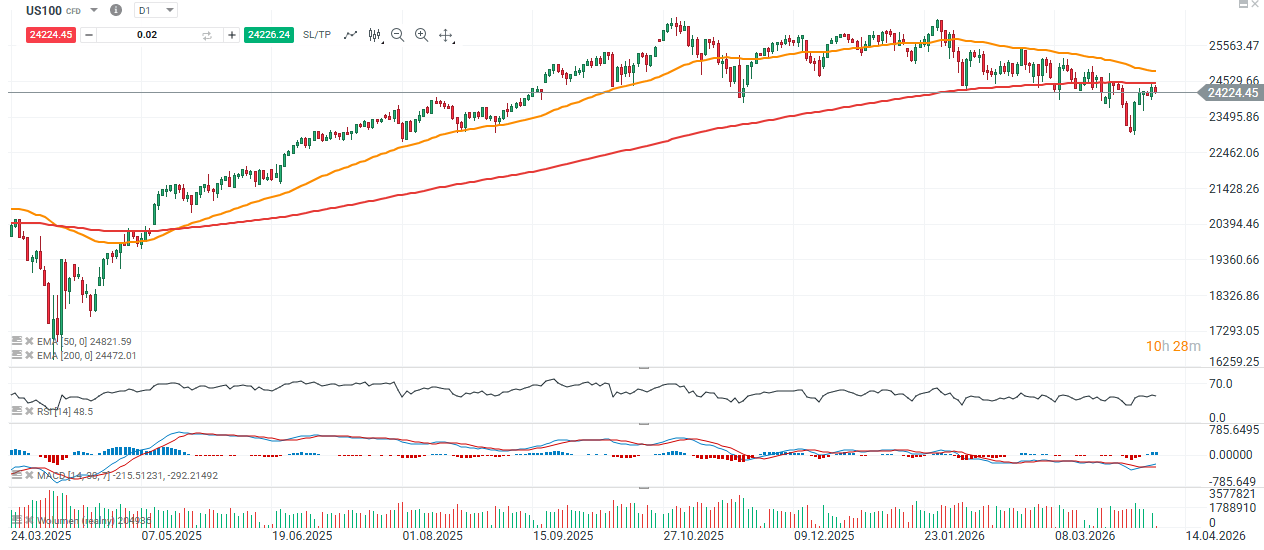 Futures na americké indexy korigují včerejší zisky, což je jasně vidět na futures na Nasdaq 100 (US100), které dnes ztrácejí více než 0,5 %. Donald Trump včera zopakoval, že rozhodující termín pro odpověď Íránu připadá na 3:00 SELČ v noci z úterý na středu. Konflikt vstoupil do fáze otevřené vojenské eskalace, přičemž obě strany provádějí souběžné údery. Izrael dokončil sérii rozsáhlých útoků na íránské cíle, zatímco Írán pokračuje v odvetných vlnách včetně úderů na infrastrukturu a aktiva spojená s USA a jejich spojenci. Pokud do večera nepřijde žádný průlom, pravděpodobnost zmírnění napětí výrazně klesne a zvýší se šance, že Trump naplní své hrozby o rozsáhlém ničení íránské infrastruktury.