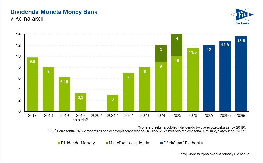 Klíčová slova: Analytik | Dividendy | Politika | Kapitál | Akcie | Valná hromada | Bloomberg | Dividenda | Dividendový výnos | Pozice | Výnos | Zisk na akcii | Česká národní banka | Analytici | Banky | Zisk | Výsledky | Analytika | Banka | Fio banka | Fio | Management | ROCE | Burze | Moneta Money Bank | Analytik Fio banky | Výhled | Poplatky | Akcie Moneta Money Bank | Výnosy | ex | CDCP | Čistý zisk | Meziroční růst | Vývoj | Akcie Monety | Historie | Růst | Návrh dividendy | Představenstvo | Zdanění | Moneta | Vývoj akcie | Akcie MONETA | Projekce | Společnosti | Aktualizovaný výhled | Společnost | 3М | Výplatní poměr | Ex-date | Analytik Fio | Kapitálová pozice | Vice | Střednědobý výhled | Čistý zisk na akcii | Fio banka, a.s. | Dividendová historie | Hrubý dividendový výnos | Akcie Moneta | Rok 2025 | Karel Nedvěd | Michal Bárta | MONETA Money Bank | Národní banka | Rok 2026 |