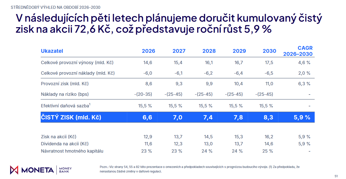 Moneta společně s výsledky za 4Q také zveřejnila střednědobý výhled, ve kterém projektuje dividendu za rok 2026 (vyplacenou v roce 2027) ve výši 11,6 Kč a dividendu za rok 2027 (vyplacenou v roce 2028) ve výši 12,3 Kč.