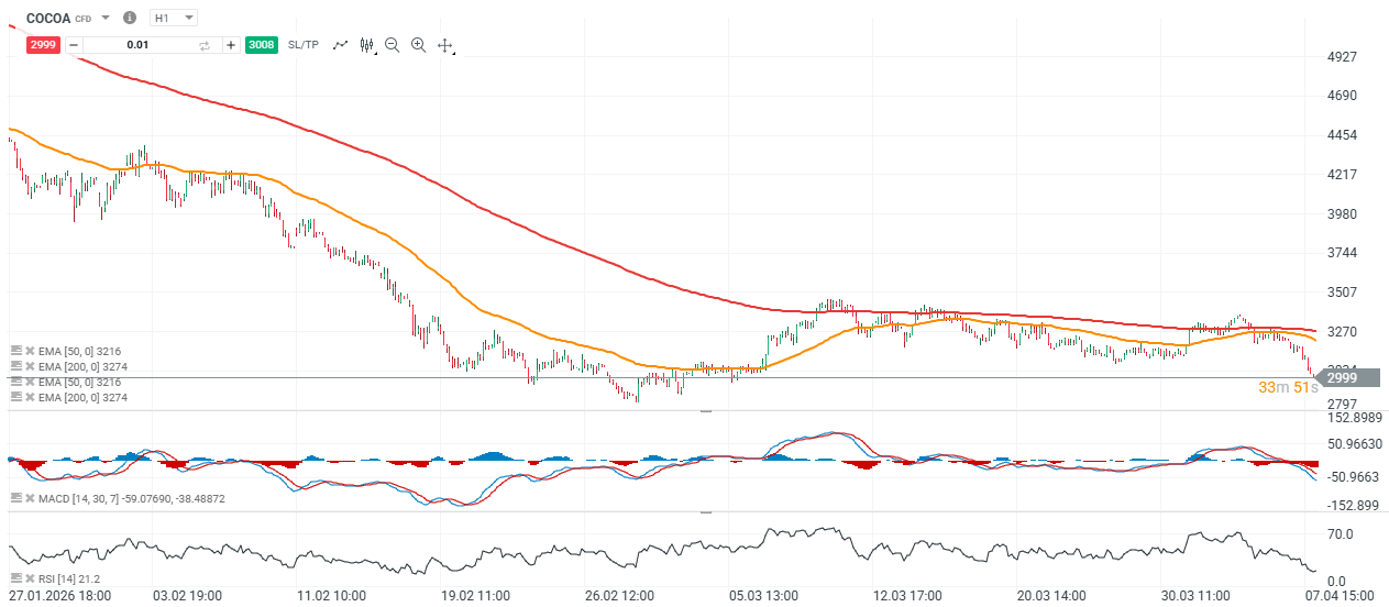 Futures na kakao (COCOA) prodlužují svůj klesající trend a aktuálně klesají o téměř 5 %, přičemž testují oblast kolem 200denního exponenciálního klouzavého průměru (EMA200, červená linie). Trh je pod tlakem kvůli silným dešťům v západní Africe, které posilují naděje na menší než očekávaný deficit nabídky v letošním roce a mohou vést ke zlepšení výhledů jak kvality, tak kvantity nadcházející sklizně. -