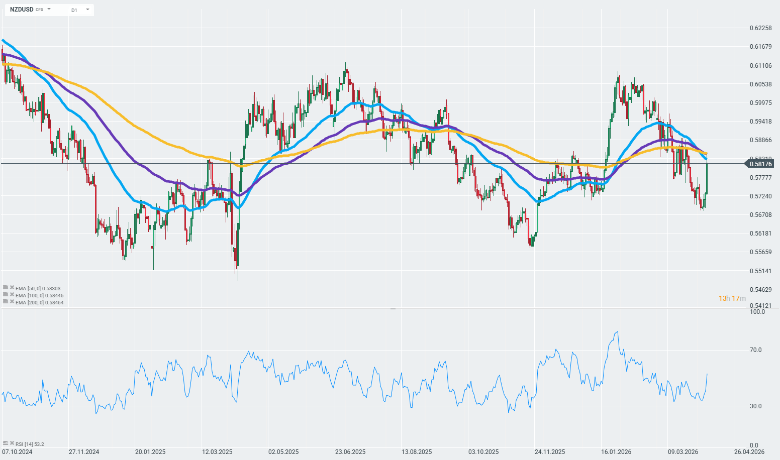 Největším příjemcem dnešní kombinace jestřábí centrální banky a globální deeskalace však zůstává kiwi. Po rozhodnutí RBNZ pár NZDUSD dočasně vzrostl až o 2 % k úrovni 0,5844 a aktuálně si drží zisky kolem 1,7 % při kurzu přibližně 0,5824. Investoři vyhodnotili vyjádření banky jako „jestřábí pauzu“ – RBNZ jasně signalizovala připravenost k rychlému zvýšení sazeb, pokud se inflace rozšíří i mimo energetický sektor a začne ovlivňovat mzdy a cenová očekávání. Zároveň banka zdůraznila, že nabídkový šok spojený s předchozím růstem cen ropy je dočasný a že slabší domácí poptávka a rostoucí volné kapacity omezují riziko druhého kola inflace.